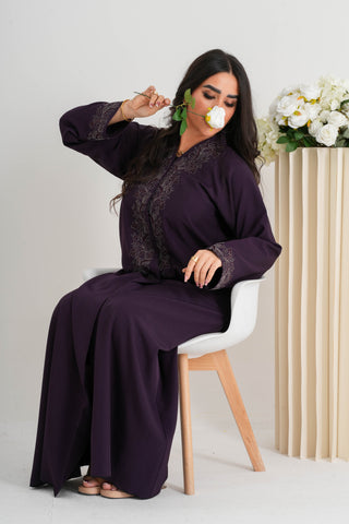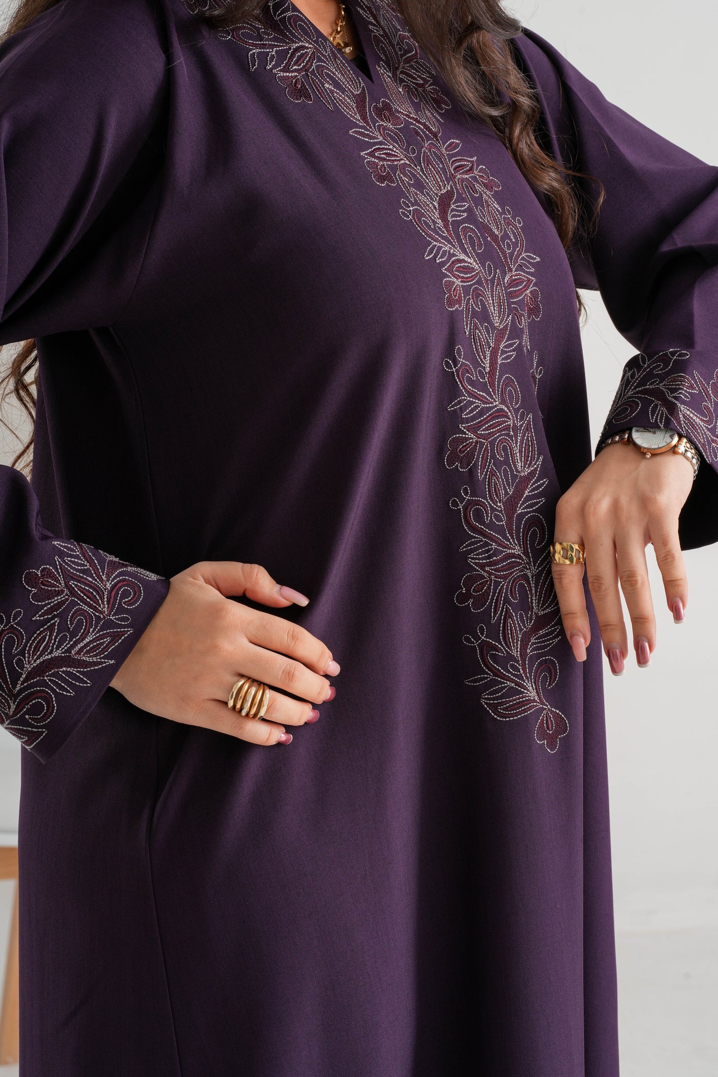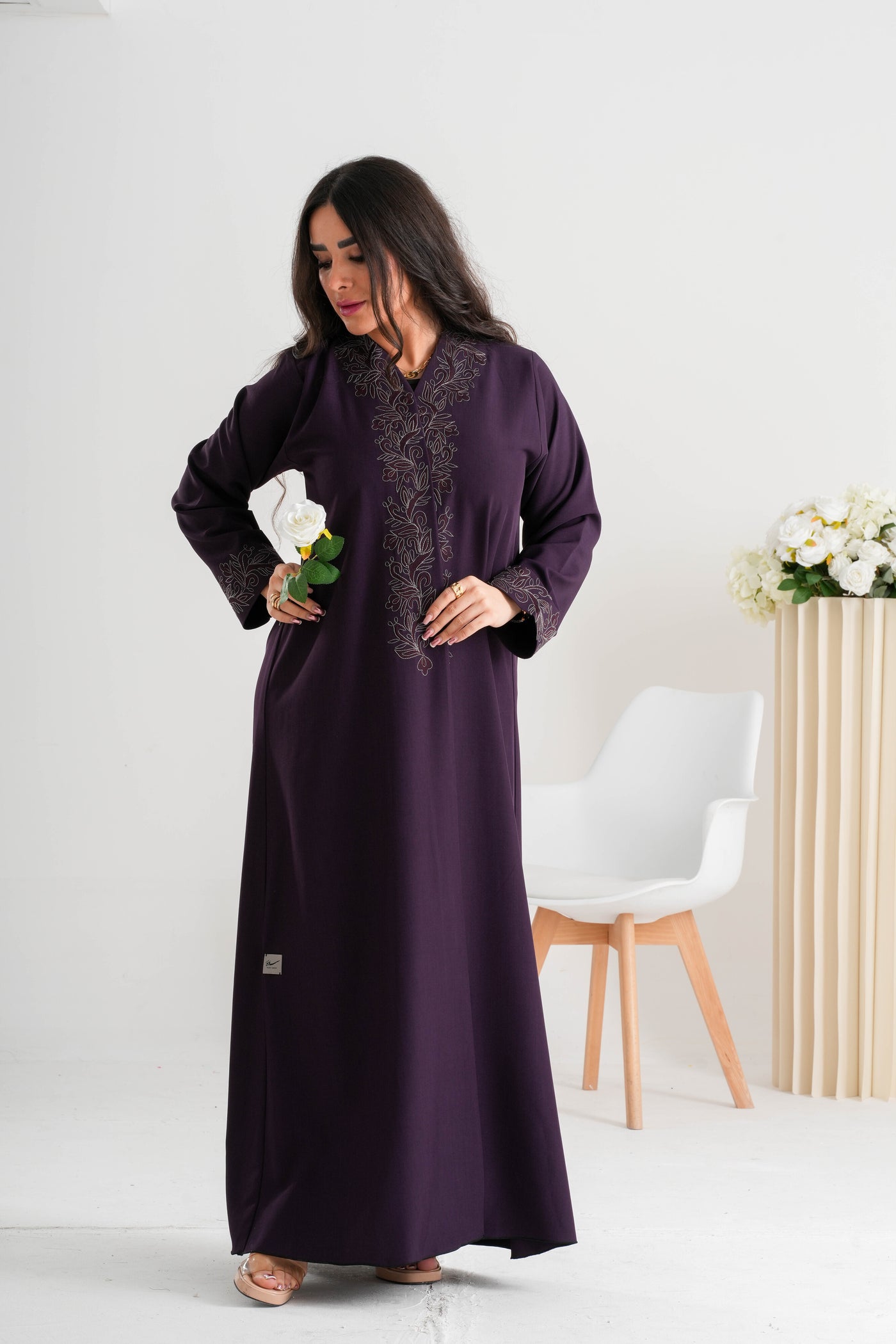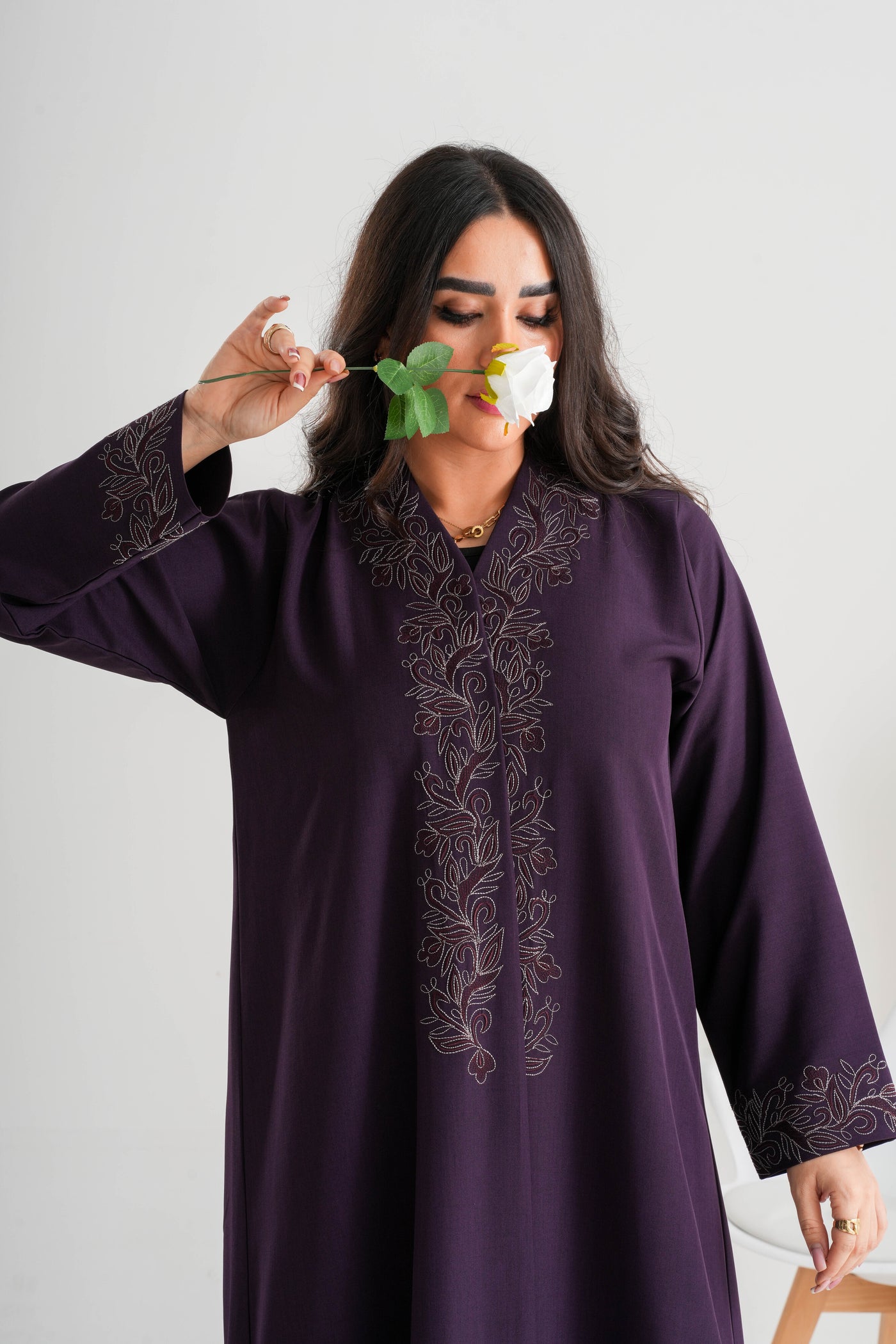 NY-78 - PURPLE ABAYA WITH FLORAL MACHINE WORK STITCHING (FUAA LINEN)
